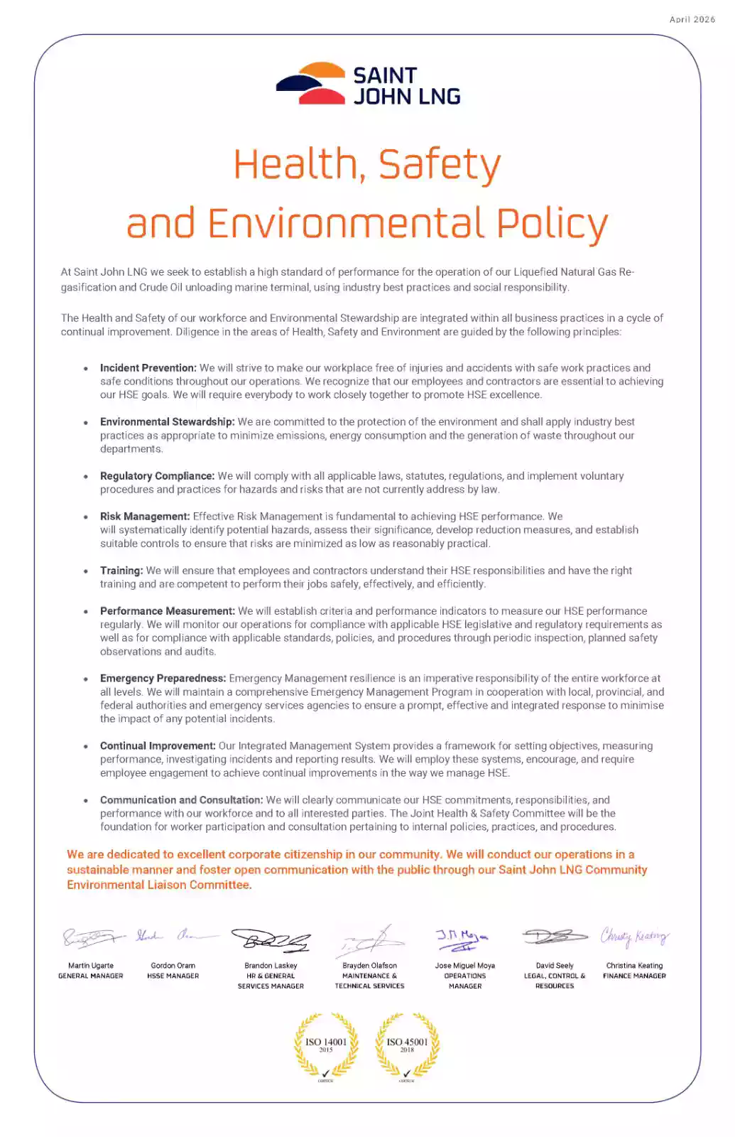 Saint John LNG is committed to ensuring the health, safety and security of our workforce and local community